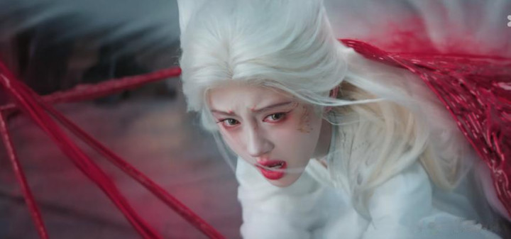 鞠婧祎脸上的粉很厚且毫无血色,再加上眼线拉长后,刻意呈现出狐狸魅惑东说念主的神韵,很怪。