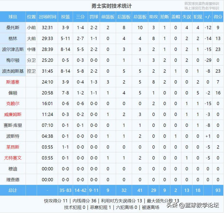 骁雄后卫波杰姆斯基投篮14中8,三分8中5,罚球2中2,拿到23分5篮板2助攻2抢断,正负值-8。波杰聚会4场得分20+,事业生活第一次。波尔津吉斯14投8中,三分5中5,罚球2中2,拿到23分3篮板2助攻1抢断,第二节率骁雄卓绝到10分。