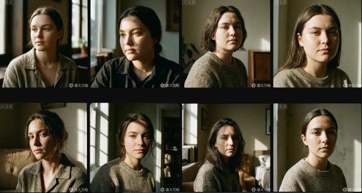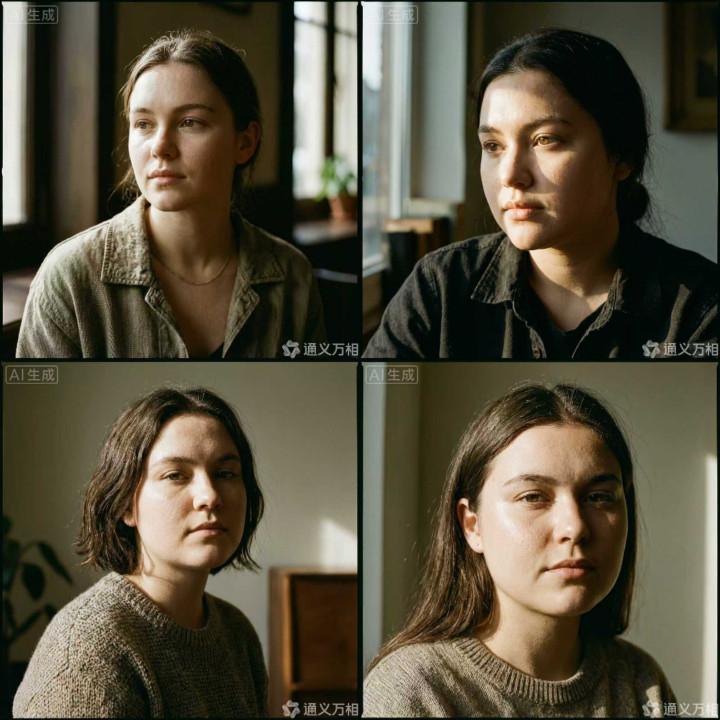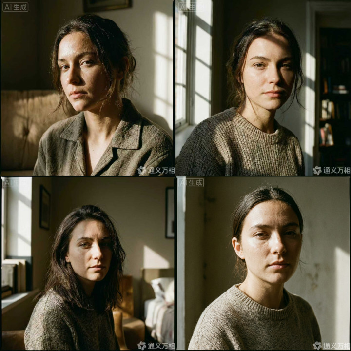 在光影戒指与合座氛围营造方面,Wan2.7-Image证实出色。四张图像均取舍当然窗光四肢主光源,形成热烈的明暗对比与电影化质感,配景环境元素虚实顺应,未对主体酿成骚动,且不同图像间的东谈主物特征保持了较高的一致性。