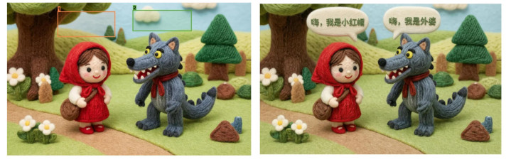 在另一官有规画例中,用户通过框选区域、指定对话气泡立场和翰墨本体,平直生成了毛毡立场的对话场景,翰墨与画面立场长入。