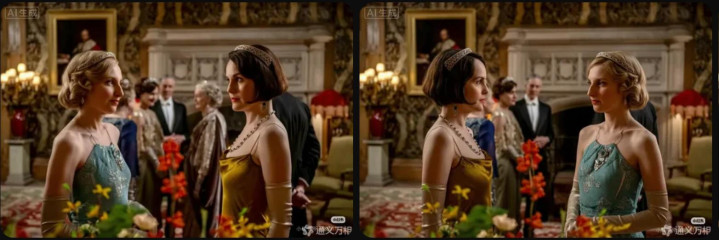实测中,咱们用《唐顿庄园》电影剧照图片践诺“两东谈主位置调换”的剪辑指示,Wan2.7-Image告捷将原图中左侧蓝裙东谈主物与右侧黄裙东谈主物的站位进行了对调。