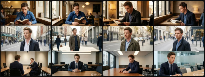 在多主体一致性测试中,咱们基于参考东谈主物条款模子生成咖啡馆、户外街拍、崇拜会议室三大场景共12张图像,模子精确保留了参考东谈主物的面部特征、发型轮廓与合座气质,跨场景辨识度踏实,同期对不同场景的光影逻辑和环境氛围适配邃密,是三项测试中证实最为亮眼的一项。