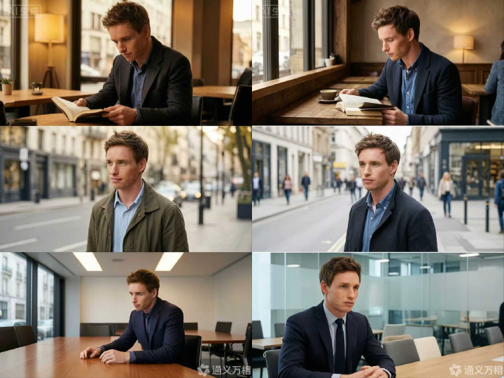 咱们基于参考东谈主物进行多场景生成测试,发现Wan2.7-Image在中枢东谈主物特征的一致性规复上展现出较高水准。模子证据指示词“基于参考东谈主物,生成3张图:(1)咖啡馆内看书;(2)户外街拍;(3)崇拜会议室”,输出了一组共12张图像。