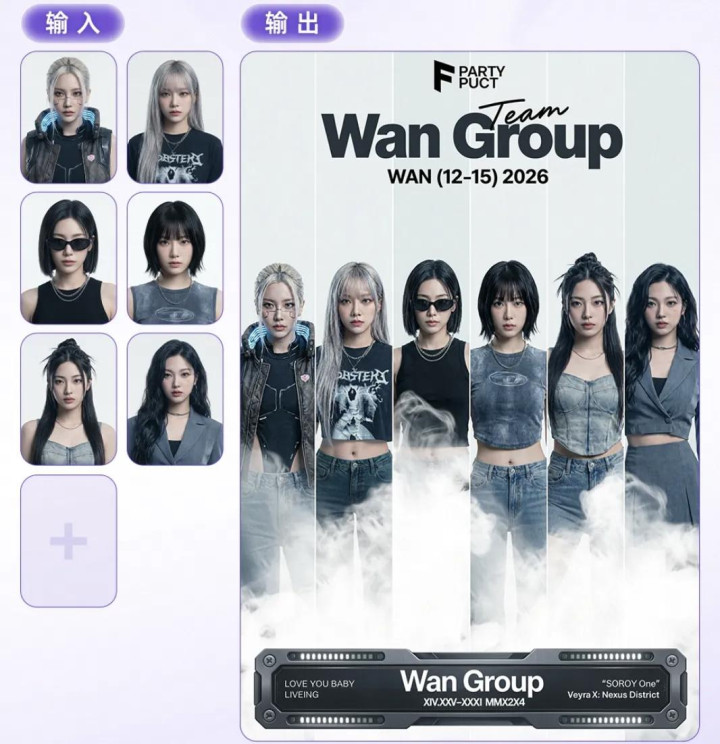 多主体一致性是图像生成中难度较高的任务。Wan2.7-Image在这一场所复古最多9图的立场与特征长入,可用于合影生成、电影海报及居品组合图等场景。官方展示了AI女团海报和居品组合图的生获胜率,多东谈主物之间的立场一致性较高。