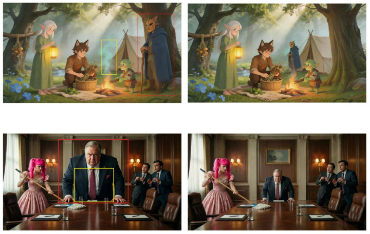 官方演示中,用户框选图中两个东谈主物后输入“互换位置”指示,模子准确完成了东谈主物交换,且配景偏激他元素保持不变。