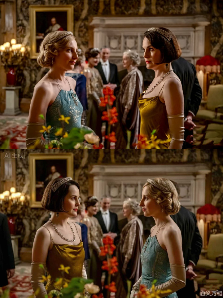 在交互式剪辑测试中,咱们以《唐顿庄园》电影剧照为素材践诺东谈主物位置互换,模子在保留衣饰特征和配景环境的前提下完成了对调。
