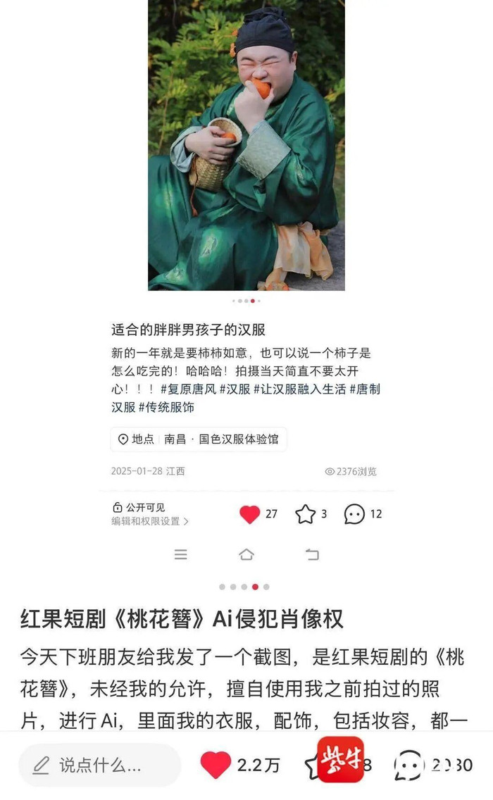 博亚(中国)体育app 素东说念主拍摄的汉服写照,疑似被短剧偷去AI生成扮装 走访:“撞脸”维权难,有横店群演500元“卖脸”